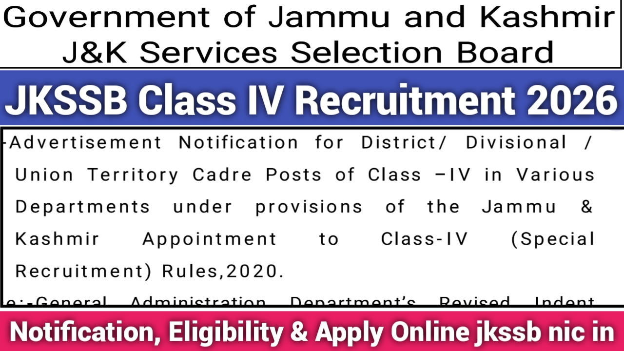 JKSSB Class IV Recruitment 2026: The Jammu and Kashmir Service Selection Board will be releasing Class IV MTS recruitment notification along with syllabus on the official website. The online applications will be inviting from the eligible candidates for participating in the selection process of District/ Divisional/ UT cadre posts across the union territory of Jammu and Kashmir. Eligible candidates must have passed matriculation (10th Pass and maximum 12th pass) from a recognized board or institution with age limit of 18 to 40 years. The age relaxation is also applicable on various categories in accordance with government rules and regulations. The last notification has been released in 2020 with a huge vacancy count 8575 across various district of UT of J&K. All candidates are must check the official notification and eligibility criteria before submitting online application. For more details, read the complete article.
