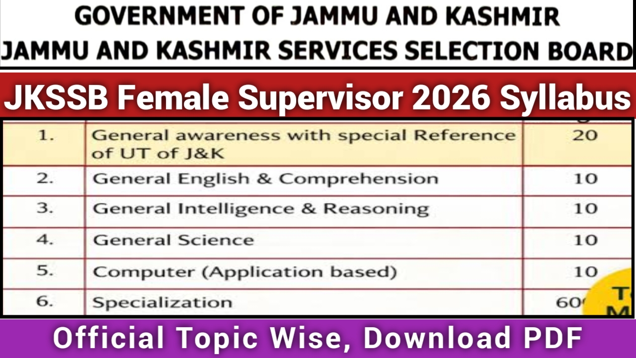 JKSSB Female Supervisor 2026 Syllabus: The Jammu and Kashmir Service Selection Board is inviting online applications from eligible female candidates for the recruitment of female supervisor. The notification under advertisement number 13 of 2025 has been uploaded on the official website. Eligible female candidates can submit their online applications from 27 January 2026 to 25 February 2026 at jkssb.nic.in . The JKSSB Supervisor exam aims to evaluate the candidates for their scientific analytical and the numerical aptitude and their general awareness over broad range of topics. Here we provide you topic wise JKSSB Supervisor Syllabus 2026 and PDF file for your reference. For more details, read the complete article.